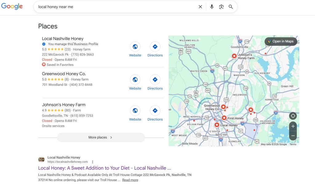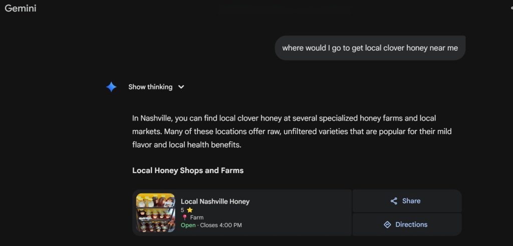 Client example: The local honey business result in AI search because of optimized Google Business Profile, Podcast and Blog content.